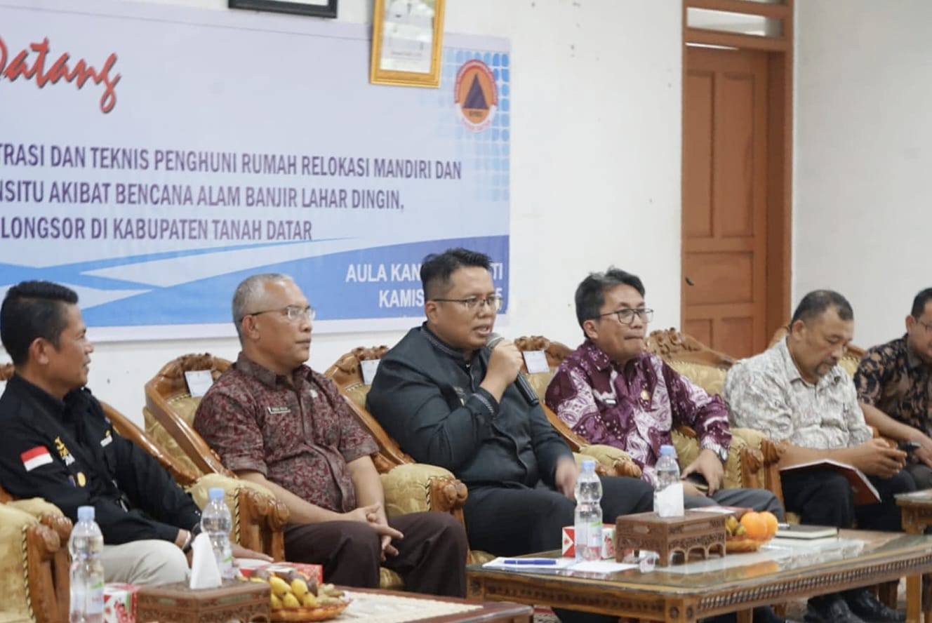 TANAH DATAR – Wakil Bupati (Wabup) Ahmad Fadly membuka secara resmi Sosialisasi Administrasi dan Teknis Penghuni Rumah Relokasi Mandiri dan Penerima Bantuan Akibat Bencana Alam Banjir Lahar Dingin, Banjir Bandang dan Longsor di Kabupaten Tanah Datar, Kamis (8/5/2025) di aula kantor Bupati di Pagaruyung.