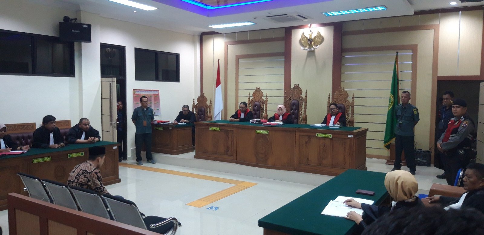 Sidang yang berlangsung dengan penjagaan ketat itu dipimpin oleh majelis hakim yang diketuai oleh Sylvia Yudiastika, SH, MH, dengan hakim anggota Arrahman, SH, MH, dan Angga Apriansyah, AR, SH.