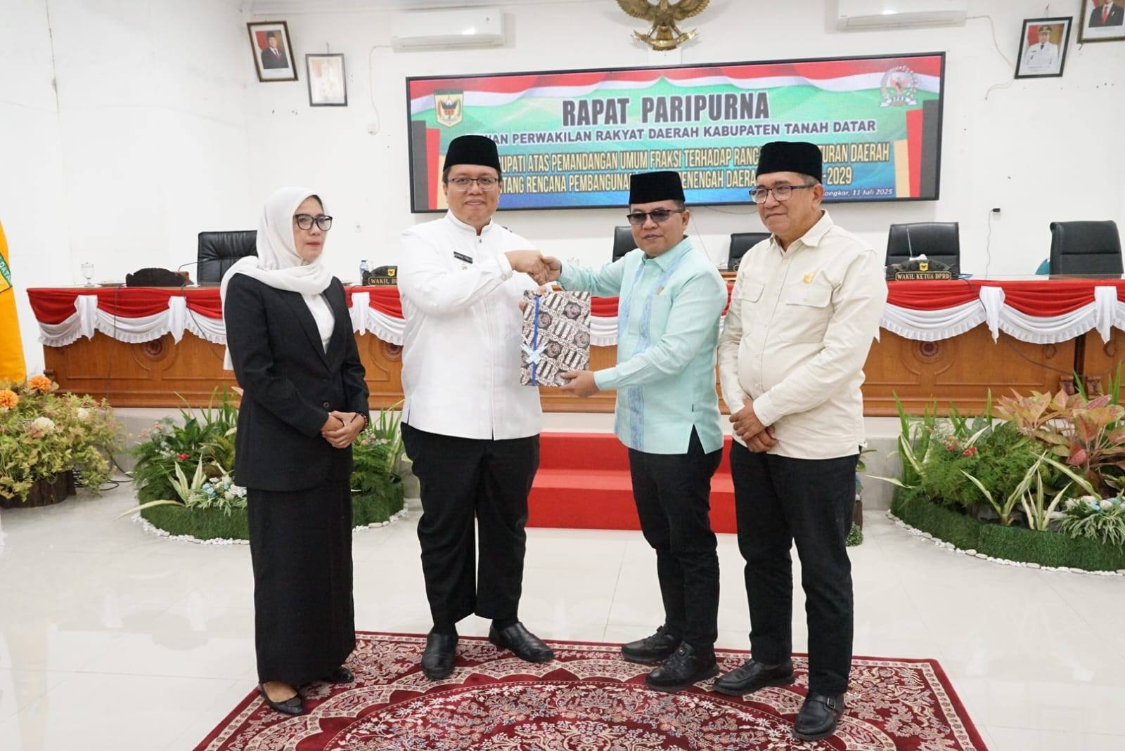 TANAH DATAR – Dewan Perwakilan Rakyat Daerah (DPRD) Kabupaten Tanah Datar menggelar Rapat Paripurna Jawaban Bupati atas Pemandangan Umum Fraksi terhadap Rancangan Peraturan Daerah (Ranperda) tentang Rencana Pembangunan Jangka Menengah Daerah (RPJMD) Tahun 2025-2029, Jum’at (11/7/2025) di Ruang Sidang Utama DPRD setempat.