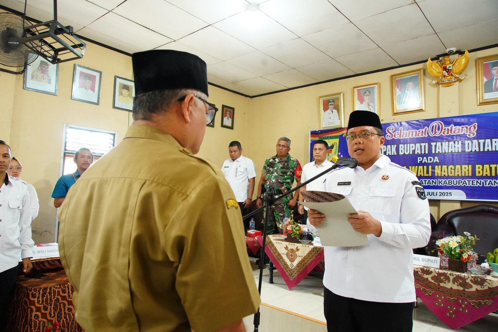 TANAH DATAR – Wakil Bupati (Wabup) Tanah Datar Ahmad Fadly secara resmi melantik Ayandi mengantikan (Alm) Yendra Gusri sebagai Pejabat (Pj) Wali Nagari Batu Taba, Kecamatan Batipuh Selatan, Rabu (2/7/2025) di Aula Kantor Wali Nagari setempat.