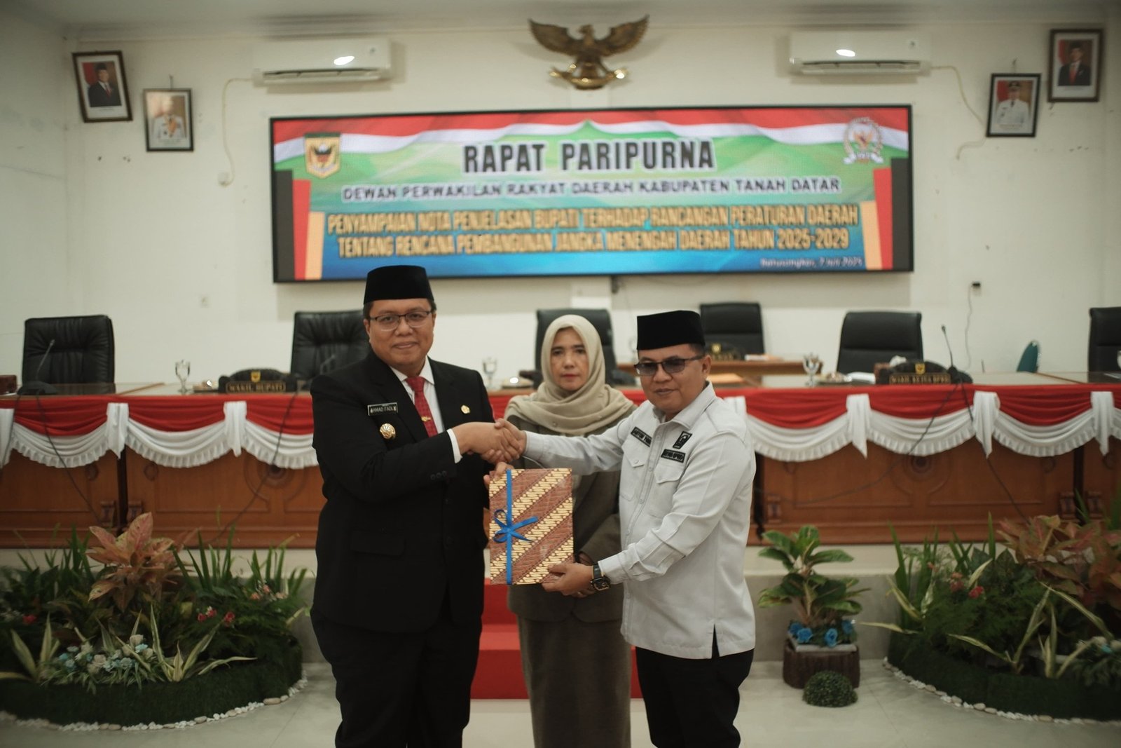 TANAH DATAR – Dewan Perwakilan Rakyat Daerah (DPRD) Kabupaten Tanah Datar menggelar Rapat Paripurna Penyampaian Nota Penjelasan Bupati terhadap Rencana Peraturan Daerah (Ranperda) tentang RPJMD Tahun 2025-2029, Senin (7/7/2025) di ruang sidang DPRD setempat.